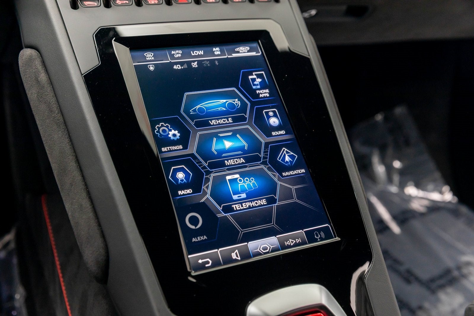- Radio: Lamborghini Touch-Screen Infotainment System -inc: 8.4" portrait oriented screen w/a resolution of 1200x1920px, multi-gesture control, connected services, 3D navigation system w/Real Time Traffic Information (RTTI), Bluetooth®, radio w/RDS double tuner, on board trip computer, 4 speakers (2 woofers, 2 tweeters), multi-media interfaces w/USB connections and full 12.3" TFT color display instrument cluster w/adaptive visualization